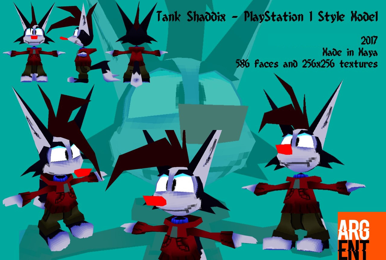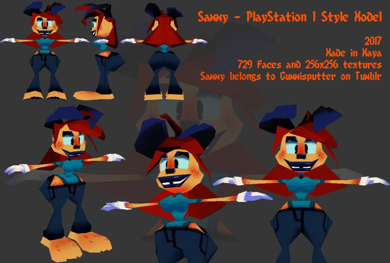 Personal work from 2017 created in Maya, intended to recreate the look and feel of 90s early 3D games consoles. This was one of my first 3D modelling projects and wanted to show how cartoon-inspired characters could work in 3D. Modelled and rigged in Maya and textured with Photoshop CC.