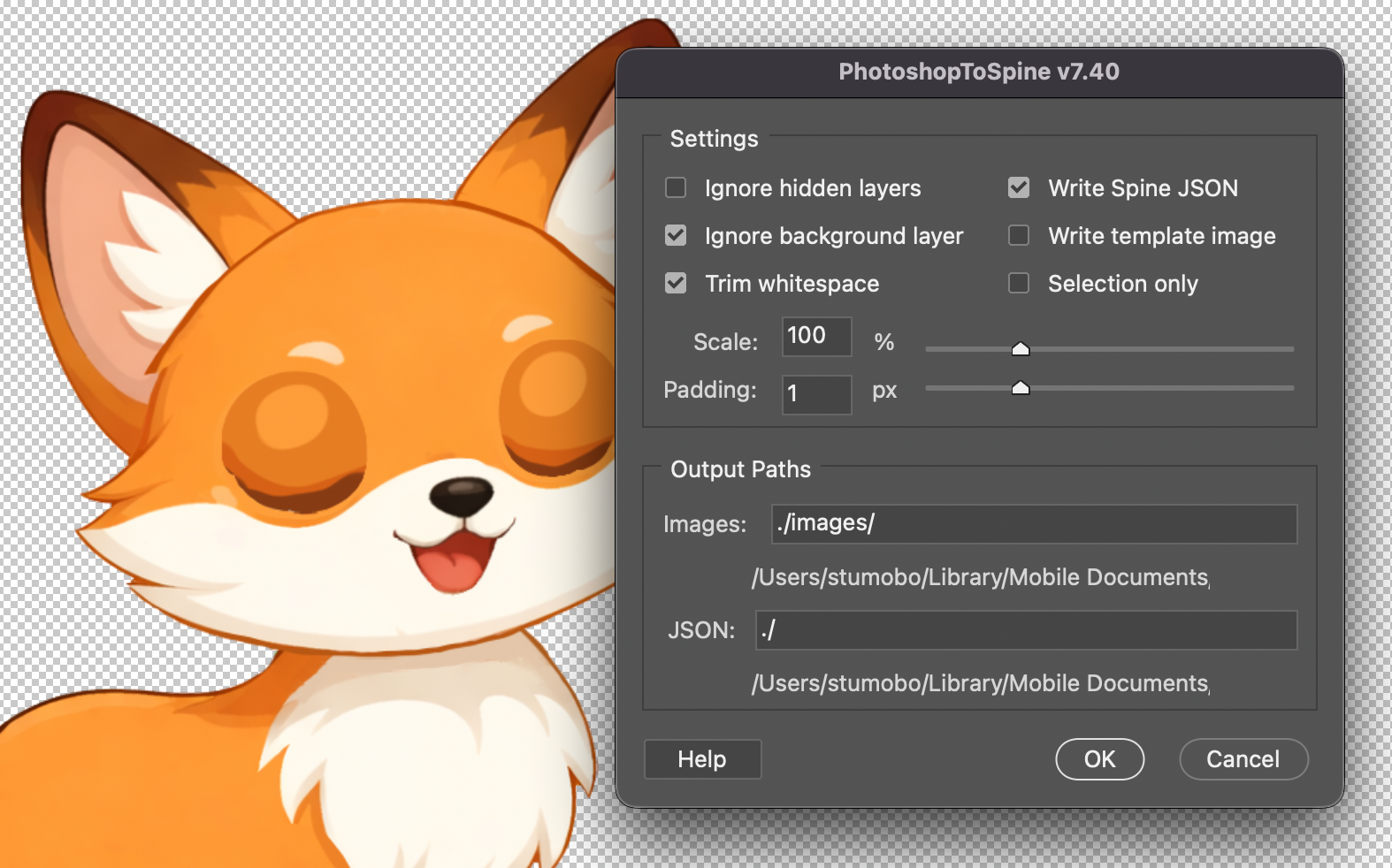 I then took that image into photoshop and cut it up using the lasso tool, I then used the hard round brush to paint in the obscured blank areas where appendages overlap with each other as well as creating additional assets such as eyelids, I then labelled every layer as what appendage they correspond to and added them into a layer folder, I then used the official spine animator PhotoshopToSpine script to automatically generate a folder and .JSON for use in spine.